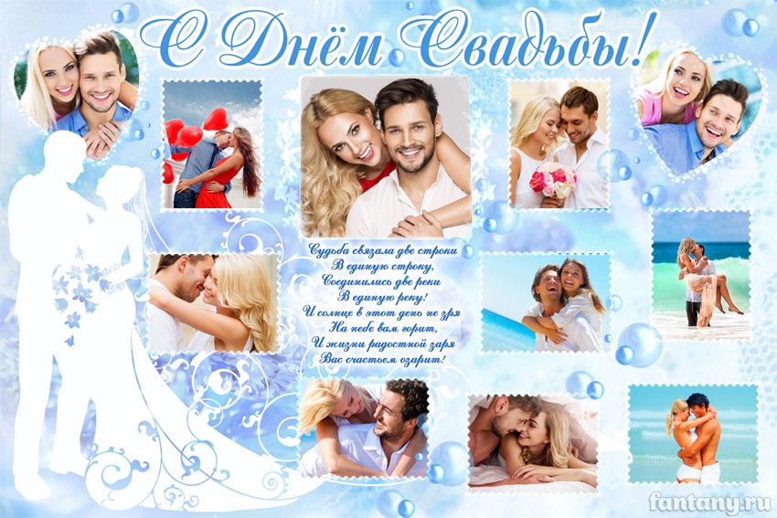Плакат «С Днём Свадьбы» в нежно-голубых тонах со стихами для фотографий молодоженов станет настоящим украшением праздника. Фотографии жениха и невесты будут размещены в белых рамочках и сердечках. На плакат можно добавить фотографии с момента знакомст...
